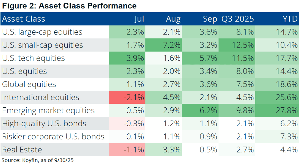 Last quarter, we noted that April showers had brought May flowers—and a few months later, those early gains have blossomed into six months of strong performance across both equity and bond markets. By the end of the third quarter, the S&P 500 had advanced nearly 14.7% year-to-date, while the broad bond market returned 6.2%, its best showing since 2020. Although risks remain, the overall outlook feels less uncertain than it did earlier in the year, providing fertile ground for continued market strength.