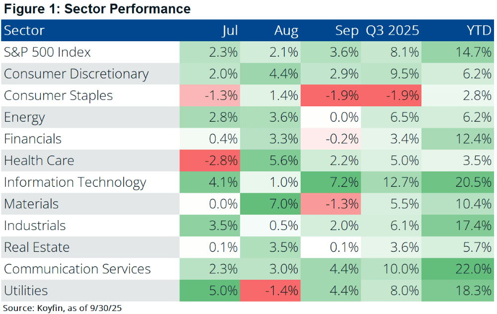 The S&P 500 advanced each month, delivering an 8.1% total return for the quarter and lifting year-to-date gains to nearly 15%, well above the 6-8% range we had anticipated for the full year. Pro-cyclical sectors once again led the way, with Technology (+12.7%), Communication Services (+10.0%), and Consumer Discretionary (+9.5%) sectors outperforming. In contrast, Consumer Staples (-1.9%) was the lone sector in negative territory, weighed down by names such as Costco, Procter & Gamble, and Coca-Cola.