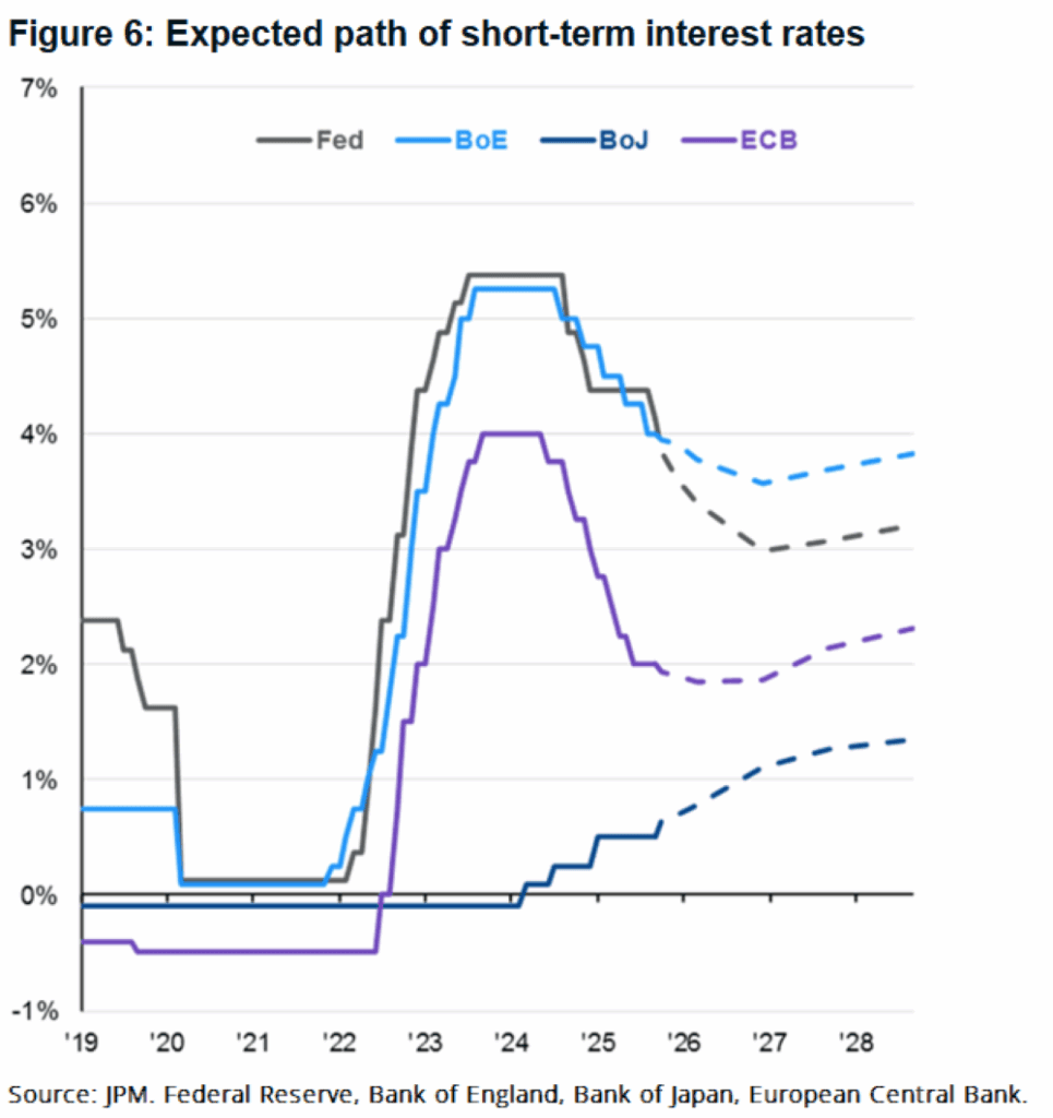 The 2026 outlook is less clear. The Fed’s latest official projections (from the June Summary of Economic Projections) call for a year-end rate of 3.6%, suggesting no additional cuts after the two expected later this year. Markets, however, are pricing in two more reductions, which would bring the federal funds rate closer to 3% by the end of next year. Figure 6 below shows the path of short-term interest rates in the United States (Fed), the United Kingdom (BoE), Japan (BoJ), and the Eurozone (ECB), as well as the market’s current expectation for their paths moving forward.