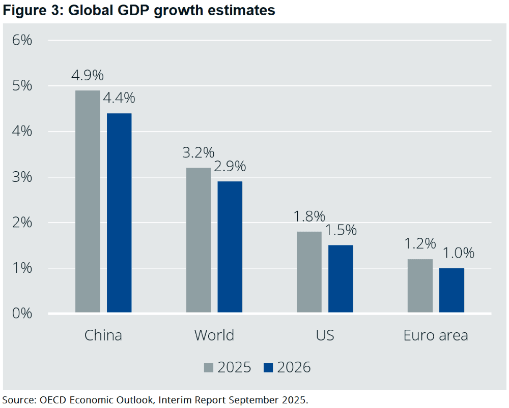 The U.S. economy remains resilient, expanding at a 3.8% annualized pace in the second quarter.  Net exports contributed 4.8 percentage points to growth, largely offsetting the drag in the first quarter when companies rushed to import goods ahead of tariff imposition. Meanwhile, a drawdown in private inventories subtracted 3.4 percentage points, reversing the “restocking” boost seen in Q1. As these components normalize, we expect growth to moderate somewhat. Encouragingly, the core drivers of the economy - consumer spending and business investment - collectively grew 2.7% in the second quarter, up from 1.7% in the first, boosted by corporate investment in AI technologies. In Figure 3 below, you can see that U.S. GDP growth expectations sit just below 2% in 2025, and that growth is expected to moderate to 1.5% in 2026.