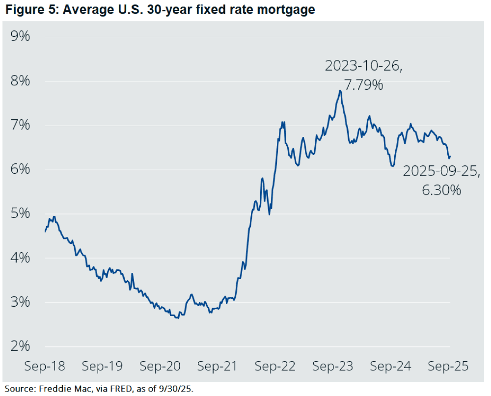 In contrast, the housing market showed surprising strength in August, with new home sales surging 21% to an annualized pace of 800,000 units. The rebound was fueled by expectations for further mortgage rate declines, along with aggressive discounting and promotional incentives from homebuilders. While revisions in future months may temper the sharp gain, history suggests such bursts in sales often coincide with periods of falling mortgage rates. The average 30-year fixed rate ended the quarter near 6.3% - roughly 1.5% below recent peaks from this time two years ago.