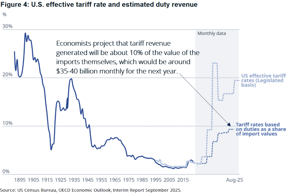Inflation edged higher from 2.7% to 2.9% in August - still above the Fed’s comfort zone but well below the levels feared when tariff negotiations began earlier this year. The muted impact likely reflects a combination of factors, including delays associated with ongoing negotiations, softer demand, and the uneven pace at which price increases are passed through supply chains. Figure 4 below depicts the projected effective tariff rate today, and how it compares historically.