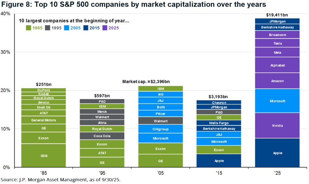 Market concentration is another dynamic we’re keeping our eye on. Figure 8 below shows the market capitalization and weight of the 10 largest companies in the S&P 500 Index for 1985, 1995, 2005, 2015, and 2025. While the weight of the top 10 companies has averaged around 18-20% historically, the top 10 companies today account for nearly 40% of the overall S&P 500 Index.